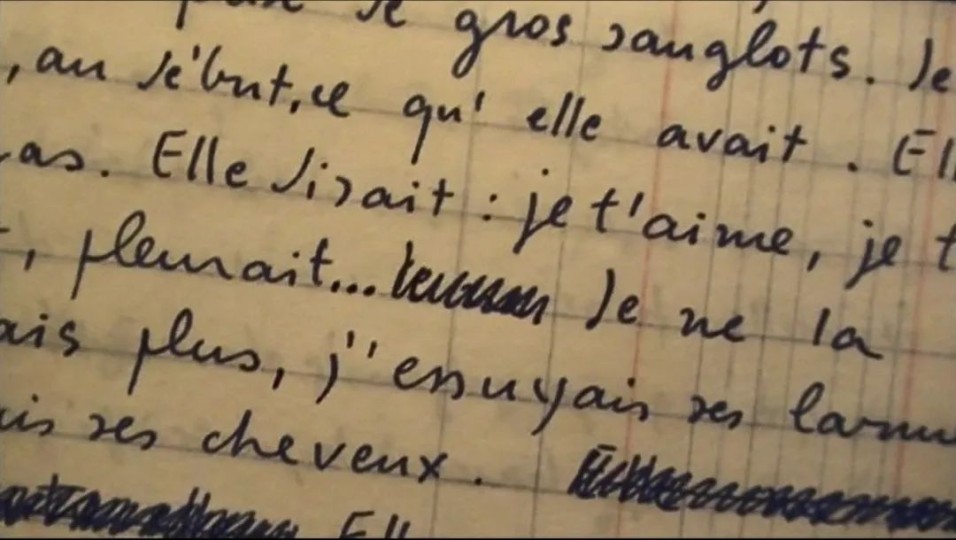 卡瓦利耶与伊琳娜交往时的笔记本,与他如今的画外音如出一辙,都记录着那些珍贵轨迹,那些他不留片刻喘息地拍摄着的这些轨迹(床单上留下的印记,阳台上的面包屑等等)。这种病态而颤抖的同质性将将书写、言语和拍摄融为一体,摧毁了真正的相遇发生的可能性,也从而扼杀了内疚的产生,取而代之的是观看菲利普·加瑞尔某些影片时初体验到的愚蠢而刻薄的怀疑:如果这些电影人只同抑郁的模特生活在一起过,好从她们的衰败中收割未来丧亲之痛的现成美学,会怎么样?他们只需要眼睁睁地望着这些模特衰败,做笔记即可。