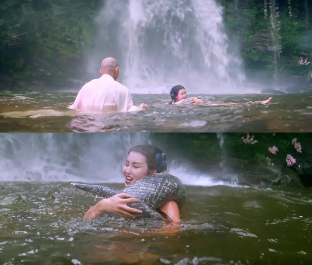 其次,这场比拼的结果是法海输了。恰如“白色圆头”的妖孽有所指一样,水中灰黑色的巨蛇亦有所指——那不是小青的尾巴,青蛇的尾巴是绿色的(电影先前展示过),且从之前的画面我们能看到:小青在被蛇尾环绕时,是有腿有脚的。