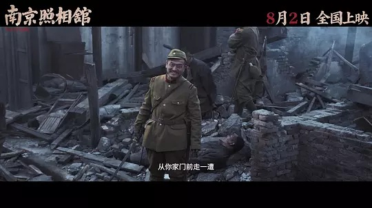 值得肯定的是,影片中的日本人形象不再是供我军轻易击倒的符号化敌人,而是被刻画得阴鸷、冷漠、残酷。影片也未采用《八佰》那般悲壮的宏大叙事,而是借“照片”这一小物件切入,以小见大,呈现大时代中小人物的命运。导演运用极其克制的镜头语言,尽可能真实地还原历史残酷的一面——焚烧、枭首、奸淫掳掠、枪决等场景并没有通过裸露或血腥猎奇的画面直接呈现,而是多用中远景、画外音等手法,隐晦而沉重地勾勒出那段人间炼狱的凄惨景象。