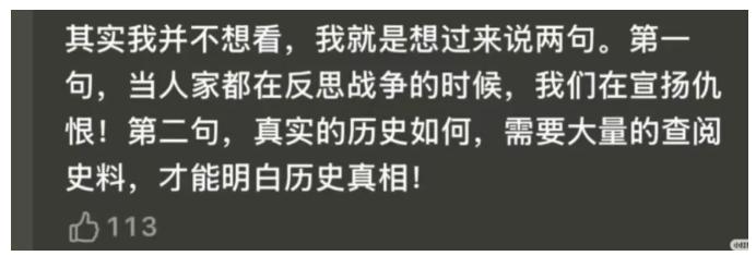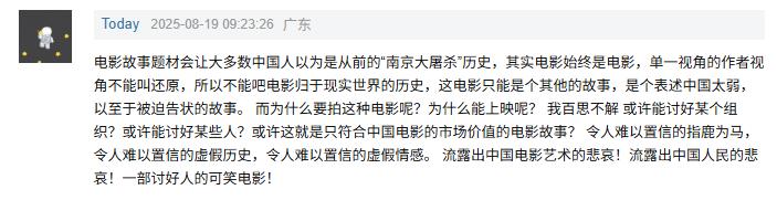 这部超过130分钟的电影,能够将历史真实地呈现在银幕之上,便已完成了其最重要的使命。日本侵略者的罪行铁证如山,至于其发动战争、实施暴行的深层动机——无论是军国主义的意识形态驱动,还是个体在极端环境下的道德抉择,本就不应指望通过一部电影来实现全面剖析,更不应由我们作为受害者的一方去承担反思的责任。我们坚持拍摄这样的影片,不仅是为了铭记历史,更是为了以真相警示世人。而日本方面应当做的,是真正直面并深刻反思其历史罪责。然而令人不解的是,国内却始终存在阻挠这类影片拍摄与上映的声音,有些人常搬出“以德报怨”“以直报怨”等看似高尚的论调,企图淡化历史的沉重与严肃。我们固然不应被仇恨遮蔽双眼, 但也必须清醒地认识到:这段惨痛的历史,本质上是不可原谅的。这并非煽动情绪、鼓动民族主义,而是对先辈们与真相最基本的尊重。
