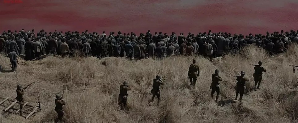 我曾一度以为他尚存良知、恪守信义,然而画面一转,他竟直接命令士兵将手持通行证的苏、林二人灭口,这招借刀杀人,配合日本军官写下仁义礼智信的时候,极具讽刺张力。敌人撕下虚伪面具,露出本来可憎的面目——战争中对侵略者抱有任何幻想,都无异于与虎豹豺狼为伴。更出乎意料的反转在于,伊藤所给的那两张通行证,反而间接导致了老金妻女的丧生。战争中,苟延残喘已是一种奢侈。就在众人以为老金妻女终于能逃出生天时,她们却惨遭杀害。那一刻的无助、恐惧与绝望,所有希望瞬间崩毁——这种极具反差的生命结局,才更令人窒息。