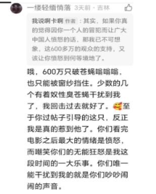 豆瓣网友 徒手剥橙 认为,我们应警惕文化创伤被完全政治化与工具化,尤其要旗帜鲜明地反对带有极端民族情绪的“仇恨”言论——这一观点我深表认同。然而,令我难以接受的是,每当有一部揭露历史真相、呈现日本侵华暴行的电影出现,它往往就被轻易贴上“煽动情绪”或“宣扬仇恨”的标签。而事实是,我们只不过是在真实还原那段侵略历史,直面日本军国主义最黑暗的罪行。一些批评者对影片大加指责,认为其过度呈现了杀戮、血腥与暴力。但作为这场灾难的受害者的后代,作为一个有良知、有血性的中国人,我们无法对这些历史事实视而不见,更不可能超然事外。