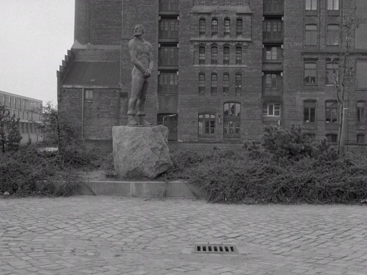 在第一个镜头中,影片确立了自己和世界的关系。一个固定镜头,平拍某栋大型仓库的一角,其中一尊海盗雕像站在看不清碑刻的石台上,双手握于胯前,扭头眺向远处;在他身后,库房延伸出形制各异的窗户,玻璃多已破损,其中一扇还突兀地装着塑料白框。墙底部,即海盗像所在的地基,是一条散乱、匍匐的绿化带,几株冒出来的小树正被风吹拂;再往外,是排列成半圆形的石头路,路上除了条排水沟之外空无一物。这个贫穷而平整的公共舞台既不属于小说,也不属于正片虚构的任何一部分。 在采访中,斯特劳布给予了重要的线索:“雕像[的镜头]指导放映员精准地调整银幕画框。在片头字幕出现之前,需要一个用来校准画框的画面,因为如果放映员只看到黑底白字的字幕,他很可能无法正确校准。” 自动时代的观众或许忘记了放映员的存在,但斯特劳布的严谨除了帮助我们去想象一门失传的职业,也代表了电影最基本的单位:一个镜头,它是电影世界存在的形式,而每一个机位,都带领我们从新的地方观看。这部与棱角息息相关的电影,首先校准银幕的四角,还有我们的眼与耳。
