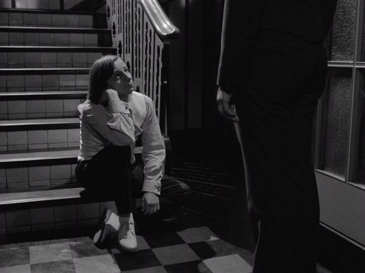 如果说《失踪者》中主角的境遇令读者联想到卓别林的电影,那么在于伊耶-斯特劳布这里,卡尔的整洁、静止、及他丢失的平顶礼帽,亦神似巴斯特·基顿。卡尔·罗斯曼由17岁的克里斯蒂安·海尼施扮演,他在于伊耶和斯特劳布的支持下辍学出演(两位导演改编自杜拉斯的短片《老调重弹》(En rachâchant, 1982)同样是关于学习的故事),这种戏剧性的身份诚然与原型互文,却并不使电影陷入主观,也不给文本徒增意义。在所有演员中,海尼施几乎是动作最少的一位,他保持着默片时代的得体。卡夫卡、卓别林、基顿,他们创造的独属二十世纪初的身体,有着无惧任何气象的英雄主义,而这也体现在卡尔静止的站姿之中。无独有偶,斯特劳布将卓别林其称为“最伟大的剪辑师”,因为“他清楚地知道一个手势(gesture)从何时开始,何时结束。” 而卡尔,这个不动的个体穿梭于变异的空间,通过一扇扇门、室内室外的过道、阳台,进入噩梦的处境,他从不做多余的辩解,也知道自己何时退场。 于伊耶谈到,《阶级关系》的摄影机是一位陪伴着卡尔的兄弟。与卡夫卡的文字不同,我们无法以卡尔本人的视角来观看他的遭遇,尽管机位有时会离他很近。这种陪伴几乎是尖锐的:没有主观镜头和传统的正反打,摄影机总是站在人物或场景的旁边,将每个角色都视为个体。演员的目光是最坚定的测量仪,他们面对景框的四边,以视线的转移、被包围时低垂的眼睑,构建着从他人到自身的位置。而脚步的断裂形成了空间的几何,同期声随分镜的切换而变化着声场,任何陡增的机位都是对表演单位的接力,会有意料外的人突现,他们拓展了剧场的边延。