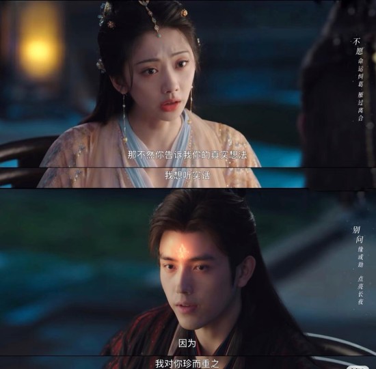 这种无条件的善意与接纳,往往是最有力量的疗愈方式。她让司马焦第一次感受到,自己并不是被期待的工具,而是被当作人、被真心看见的存在。就像司马焦自己说的那样,别人要么敬畏或者利用他,要么想封印或者杀了他。只有她把当成路边的树木,石头平等对待。 他一次次借助真言之誓来试探停雁,从最初想确认她是否真的没有杀意,到后来想知道她会不会离开自己,其实都是在弥补早年缺失的安全感。这种外力,就像是他构筑起的一道“心理拐杖”,帮助自己暂时对抗不信任与不安。在剧情里,停雁因频繁被下真言之誓而愤怒,主动与他沟通,提醒他想要知道别人的真心不是只有这一种方法,并且也撕开了他内心的防线,让停雁知道原来这个男人对她珍而重之,不舍得她有一丝伤害。在这点上,雁雁才是那个心理更为健全的人,她用行动与理解教会司马焦,信任的根本在于心。