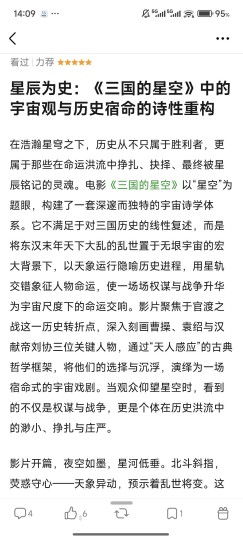 医疗预警:高血压、冠心病患者慎入! 此外,文末有彩蛋。 影片为了洗白曹操,大幅度抹黑董承、袁绍等历史人物,编造那些根本不可能存在的曹操与汉献帝之间的㚻情,而曹操这个屠城、灭别人全家、以人肉做军粮、坑杀降卒、强抢寡妇、把寡妇分配给士兵、徭役繁重等苛政、袁绍曾大力帮助他却被过河拆桥全部被隐瞒,并且曹操还变成了一个圣母,甚至还出现汉献帝喝退袁兵、袁绍被曹操俘虏的魔幻场景。这和他本人反复多次声明不要看的、极度讨厌的《三国演义》本质上高度一致,都是立场先行,扭曲历史,捧一踩一。而影片某种程度上比《三国演义》还要恶劣一百倍,《三国演义》是基于历史改编的,七实三虚,而这部影片,能有三分真就不错了,基本完全不符合真实历史,几乎一点真的历史都看不见,说它三实七虚都是抬举它的。从历史层面而言,这部影片是0分。 关于真实历史,同样批评《三国演义》的知乎博主杨沐梓的考据对比当年的《品三国》就高下立判了:https://douc.cc/4b7WcV 这其实就是真学术人和学术明星的区别。 影片完全颠覆了史书中曹操的形象,我不知道如此毁史的行为,为什么会被大量好评说考据严谨、符合史实,这恰恰是一种最大的讽刺。 然后说一下剧情,所有反派都很脸谱化到一种莫名其妙的感觉:比如董承就是那种无缘无故敌视曹操,曹操和董承第一次相见时,曹操拿着粮食准备给汉献帝,结果董承说这个地方是董卓的住所,然后汉献帝就莫名其妙的生气,董承无缘无故莫名其妙之前没有任何争端就要来挑拨离间是为了什么?影片中从头到尾充斥着各种莫名其妙的情节,在叙事上,这部影片同样是0分。 易教授为了自己心目中的曹操,展现了“我不入地狱,谁入地狱”的佛陀心境,真的佩服! 另外给大家科普一下行业内的一个情况,因为我自己也曾经是一个行业内从业者嘛,依然是能深深理解一个电影为什么票房扑街、观众骂声不断,却有极少的一星二星和极多的三四五星,我们那时候让刷分的时候就是可以复制他们给的内容也可以自己写内容但绝对不可以低于三星,只不过自己写的只给5块工钱,按他们的给了五星四星并且用他们的文案就是7块钱工钱,为这事我只能为了高工资用他们的文案和规定的四星五星了,所以也就解释了为什么有那么多三星评分的影评整体是贬低这部影片,而且几乎贬得一无是处,五星四星AI评论满天飞了。