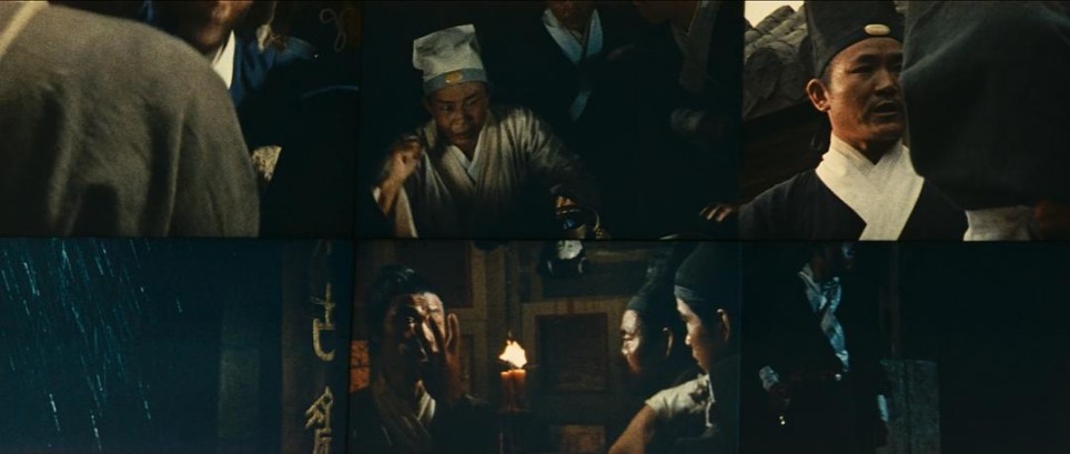 另一处是男主角设计,让家母去散步鬼神的谣言,此时使用了相当少见的多画面构图。本人时常听说这种构图,难以在电影中窥得一见,见到时激动了好一阵子。而且这里的多画面使用的非常巧妙,不仅快速进入了下一场戏,而且省去了不必要的叙述过程,诙谐地呈现了谣言多渠道的快速散播过程。