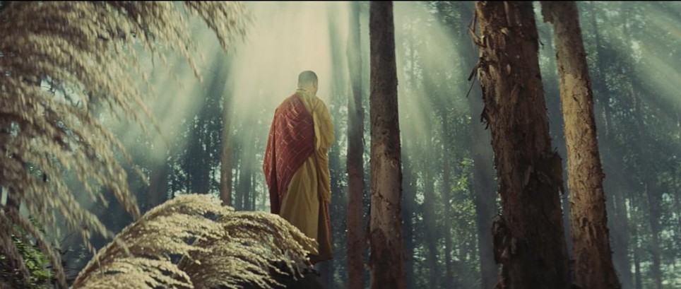 袈裟和慧园法师我们不妨放在一起讲。电影中的慧园法师大有大他者的意味,他跳脱于世俗,不为世俗所束缚,并且具有非常明显的神性。在混乱的打斗中,慧圆大师始终持握念珠,代表着他内心的如如不动。无论外界如何纷扰,他所代表的佛法秩序和内心准则不曾紊乱。念珠是他作为“佛之符号”的身份确认。而法师也不再是具体的人物,而是佛性、慈悲与超脱的化身。他的白袍、光环和最终的“肉身放光”,都是其神性所指的视觉强化。他的核心功能是“渡化”——渡化恶人,也渡化侠女。他代表了解决世间恩怨的终极方案:不是暴力消灭,而是精神救赎。而所谓的神性在电影中可以说毫不掩饰。慧园大师永远背光出镜,光线环绕他成为他的光环;他的血是金色的,代表着圣洁;在电影的最后,他还成为了完全倒影,五官特征消失并成为了佛的完全象征。