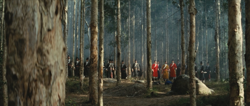 最后我们不妨谈谈打戏。胡金铨电影里的打戏个人相当喜欢,对比张彻的电影,胡金铨的打戏更加流畅也更加不流畅:一方面动作的设计更加快速而完整,发力清晰,没有兵刃相接前收力的感受,另一方面,更加强调传统戏剧的亮相,在每一段打戏前后都有停顿(注意是一段而不是一个,个人感觉其打戏流畅的感受重点就在于不像此时港片每一个动作都有相应的定格)。还有一点很有意思,打戏前后胡金铨相当擅长构建大军压境的绝境感。通过固定机位拍摄设计完好的反派站位,再通过纵深调度,产生“集合”到“出动”的实感。而每次的站位都很美妙,我们直接看图。